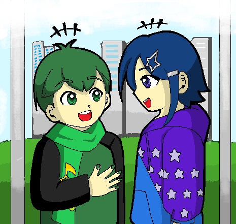 二色紅美子さん(ルビーがモチーフの子)と金剛大哉さん(ダイヤモンドがモチーフの子)が、一緒に焼き芋を食べています🍠