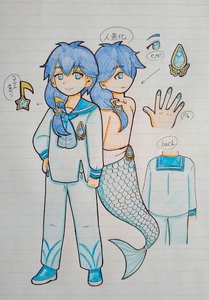 水に入ると、魔法が宿った胸元の雫型のアクセサリーで自然と男性人魚(イラスト右側)に変身することが出来る。